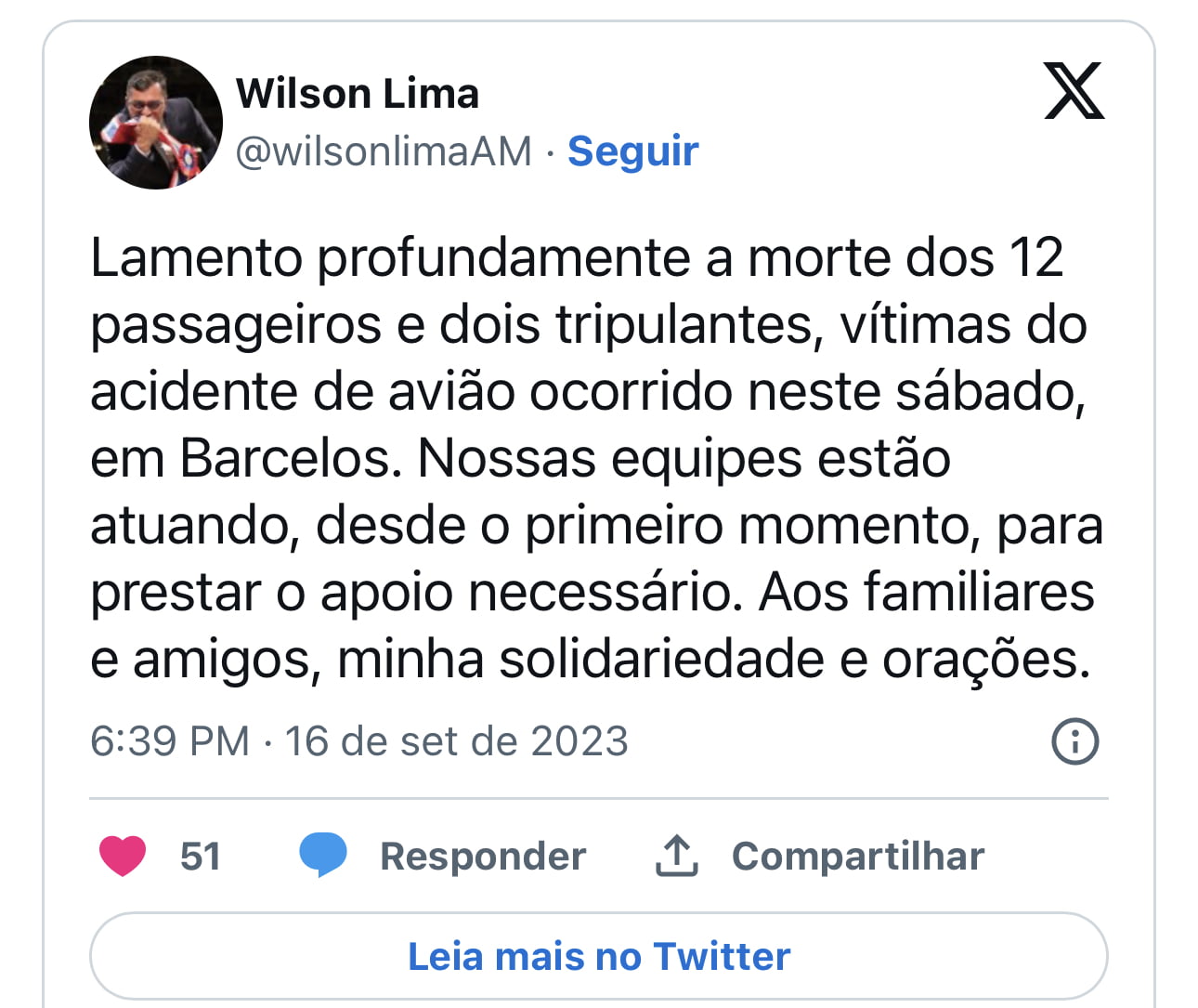 Em suas redes sociais, o governador do Amazonas, Wilson Lima (União Brasil), lamentou o acidente. “Nossas equipes estão atuando, desde o primeiro momento, para prestar o apoio necessário. Aos familiares e amigos, minha solidariedade e orações”, escreveu.