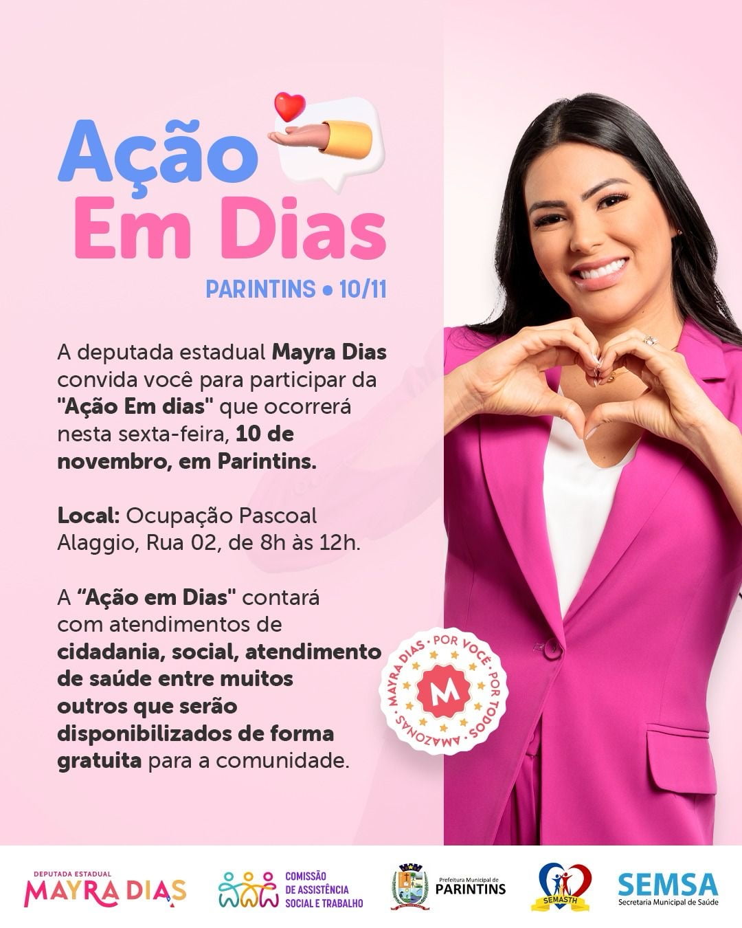 Nesta sexta-feira, dia 10, a deputada estadual Mayra Dias (Avante) vai levar o projeto “Ação em Dias” de saúde e cidadania para a ocupação do Pascoal Alaggio, abrangendo as áreas do Layde Laura e Nova Conquista, em Parintins. O evento será realizado na Rua 2, das 8h às 12h.