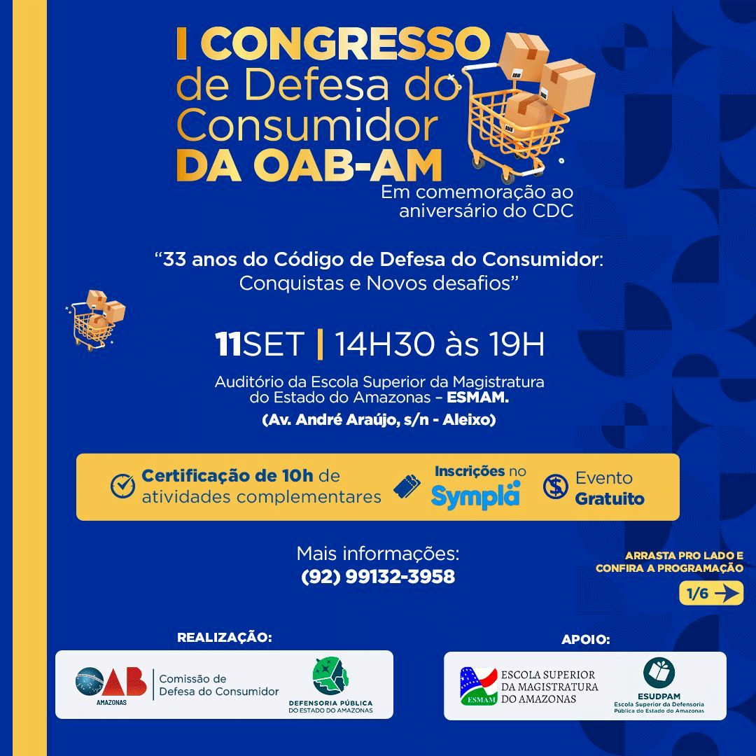 Na próxima segunda-feira, dia 11 de setembro, a Ordem dos Advogados do Brasil – Seccional do Amazonas (OAB-AM), em parceria com a Defensoria Pública do Estado do Amazonas e a Escola Superior de Magistratura do Estado do Amazonas (ESMAM), promoverá o I Congresso de Defesa do Consumidor da OAB-AM. O evento será realizado em comemoração aos 33 anos do Código de Defesa do Consumidor e acontecerá no auditório da ESMAM, prédio anexo ao Tribunal de Justiça do Amazonas (TJAM), das 14h30 às 19h.