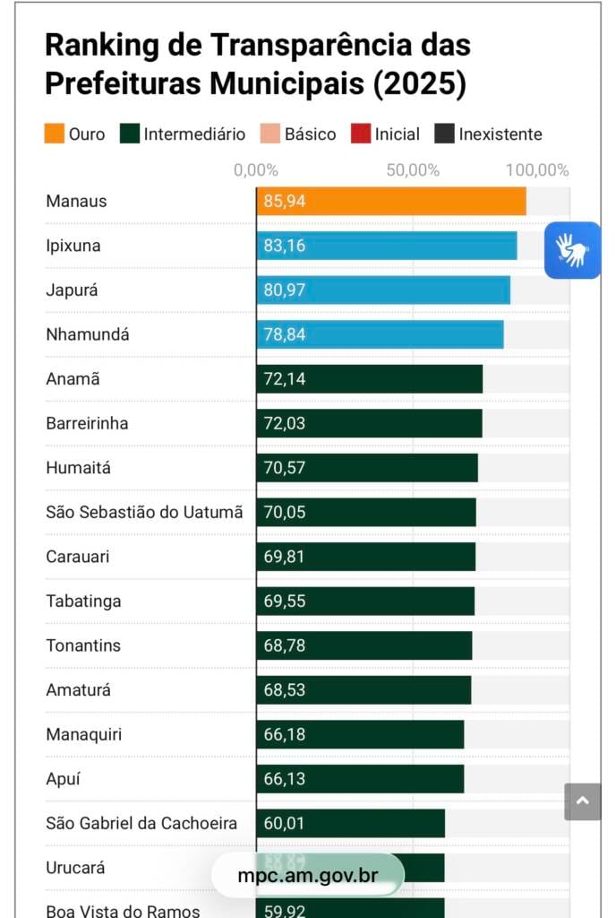 Japurá conquista 3º lugar no ranking de transparência do Ministério Público de Contas e supera grandes municípios do Amazonas