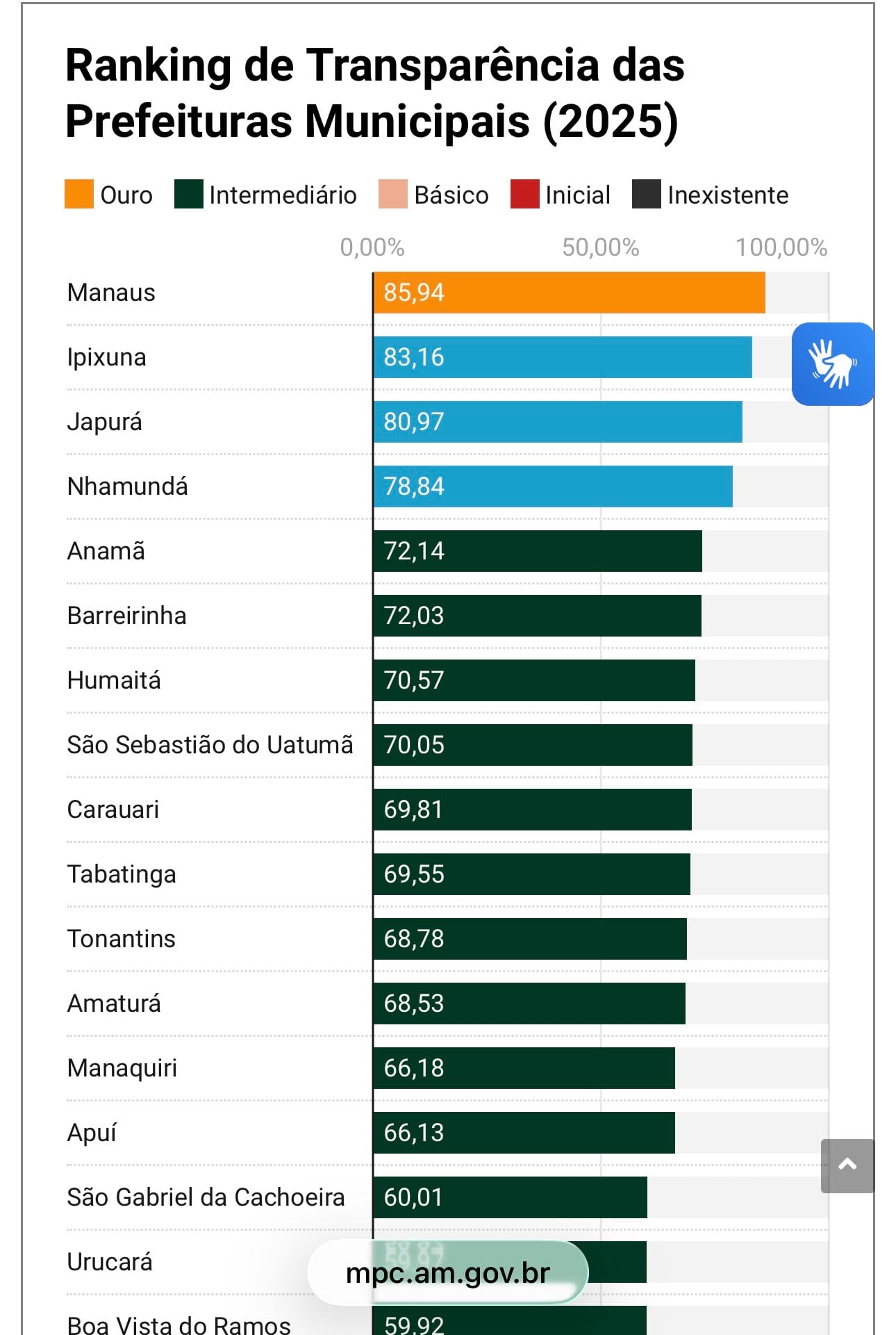 O município de Japurá, administrado pelo prefeito Professor Vanilso Monteiro, alcançou um feito inédito e histórico ao conquistar a 3ª colocação no ranking de transparência do Ministério Público de Contas do Amazonas (MPC-AM), através do Radar de Transparência Pública.